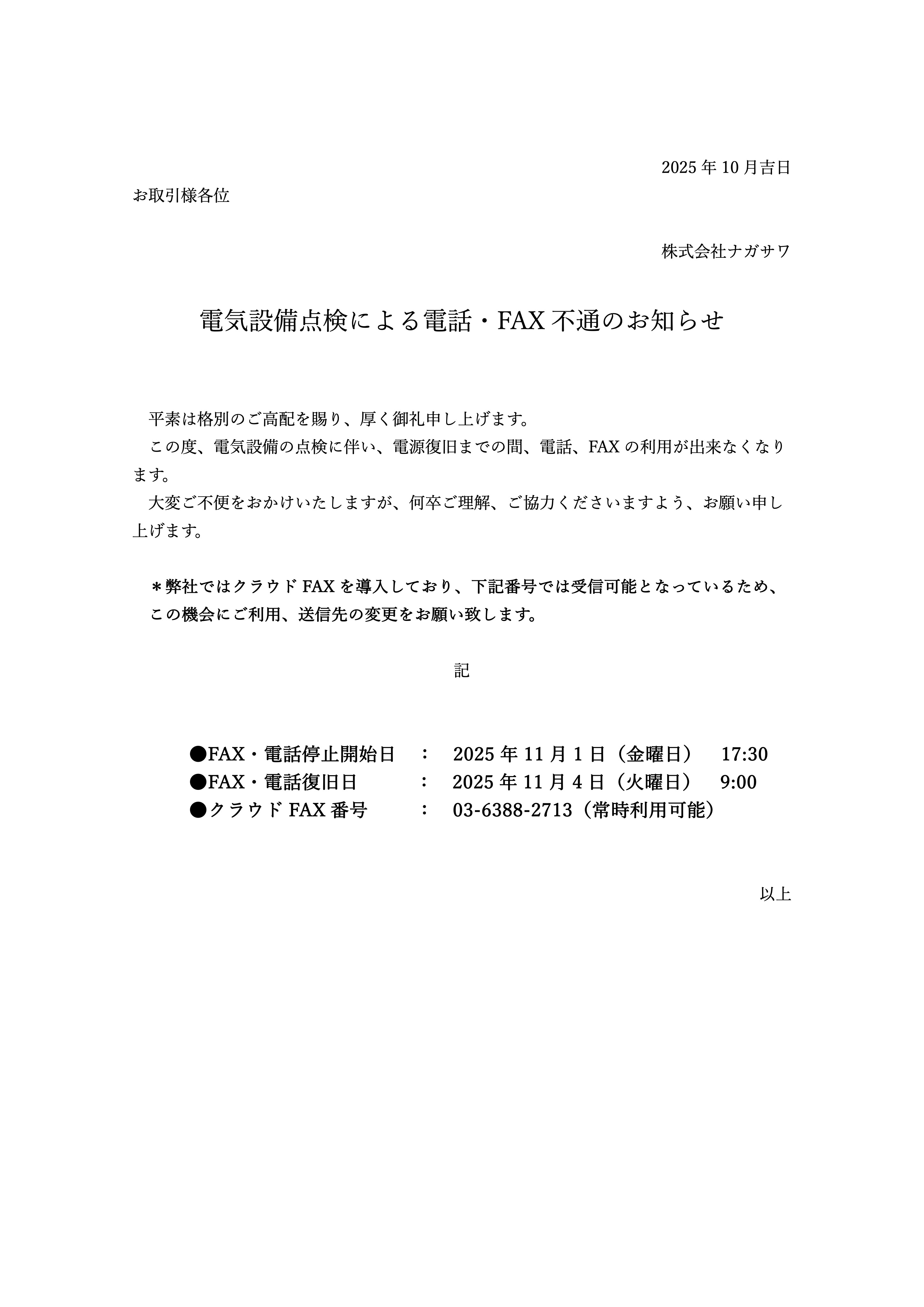 2025年10月 電気設備点検による電話・FAX不通のお知らせ