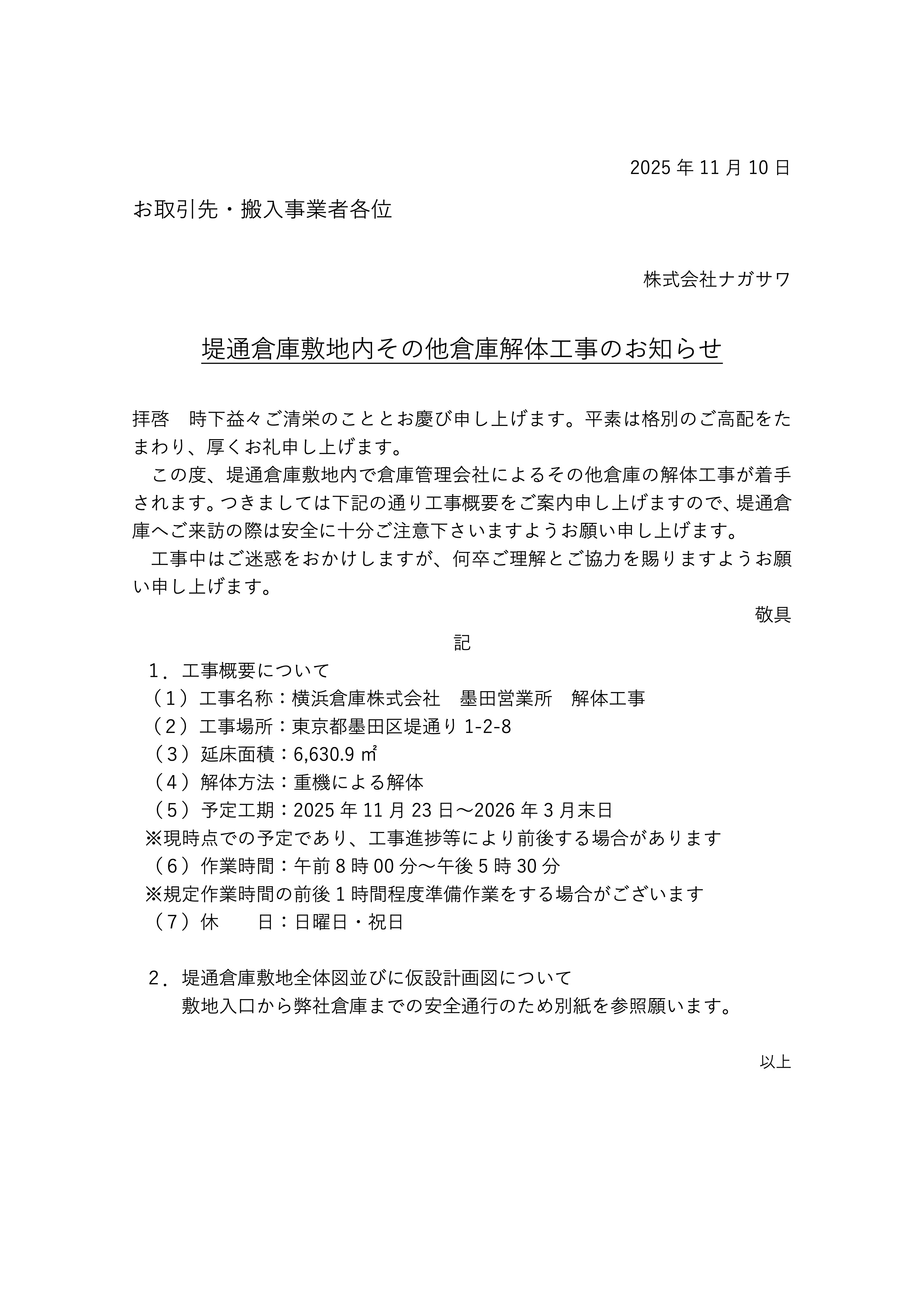 2025年11月 堤通倉庫敷地内その他倉庫解体⼯事のお知らせ